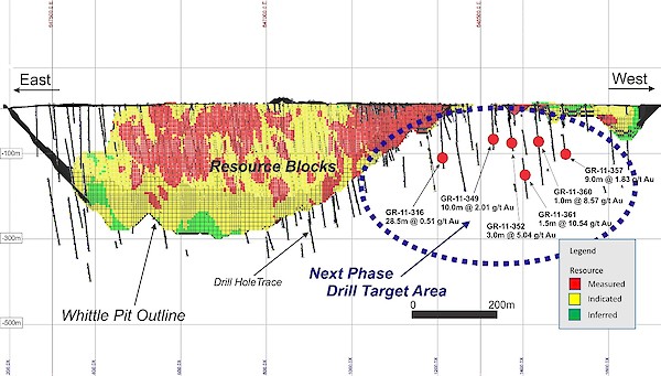 Future drill programs will see drill tests of recent strong results from deeper holes below the Pit-Constrained Resources: 8.39 g/t Au over 6 meters in hole GR-18-03 and 8.15 g/t Au over 3 meters in hole GR-18-01 (See Press Release January 8, 2019). Planning is also underway for in-fill drilling later in the year to convert Inferred Resources to Indicated Resources in the current Pit-Constrained Resources.